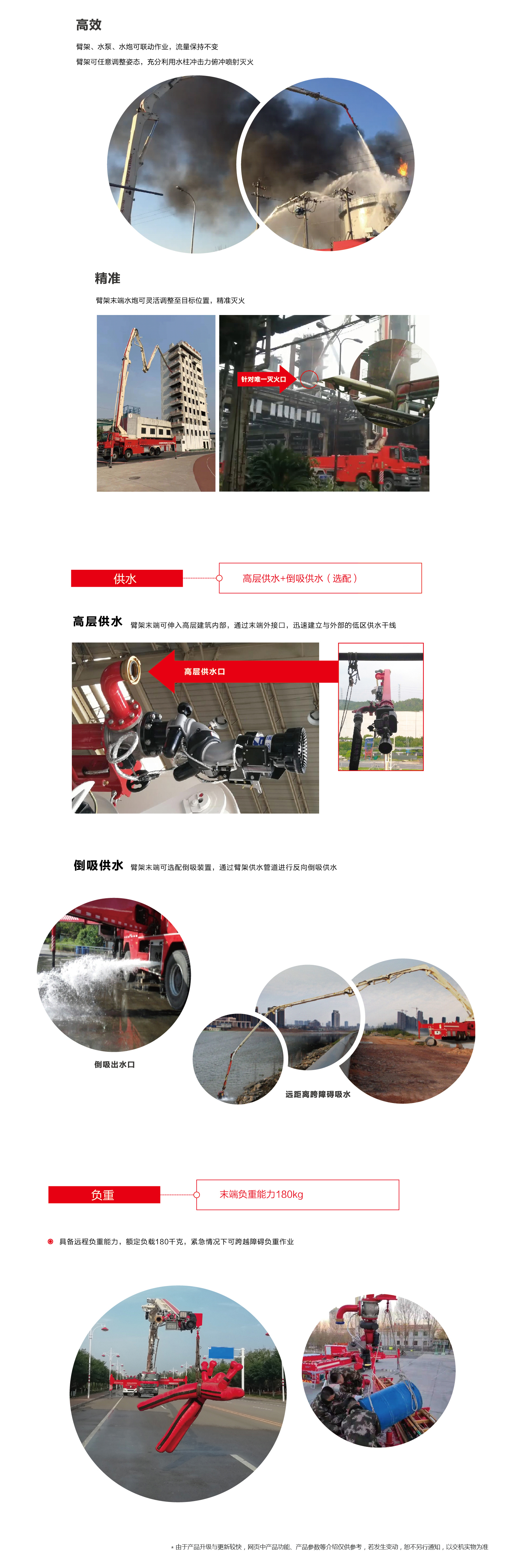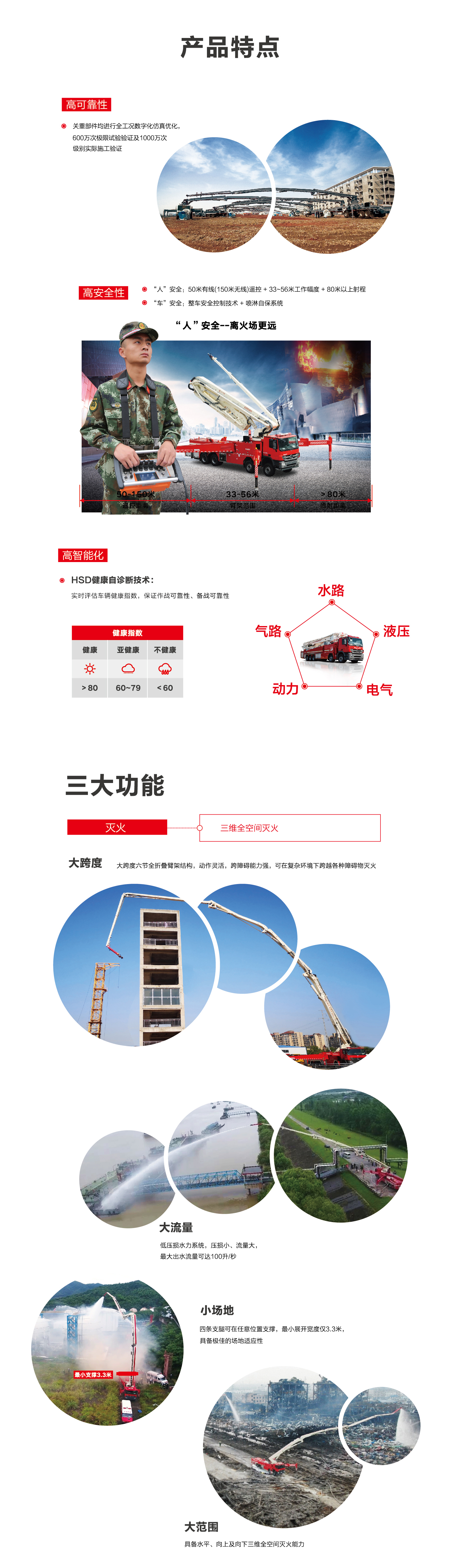 整車(che)具(ju)備(bei)水平跨度大(da),跨障能(néng)力(li)强,精(jīng)准灭火;任意支撑專(zhuan)利技(ji)術(shù),支腿支撑占地小(xiǎo);臂架水炮聯(lian)動(dòng)操作(zuò);实时火場(chang)视频监控;50米有(yǒu)線(xiàn)遥控及(ji)150米无線(xiàn)遥控;200千克负重(zhong)救援;高(gao)层供水等(deng)功能(néng)。